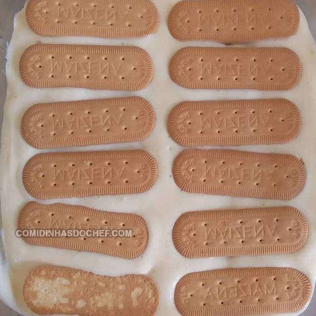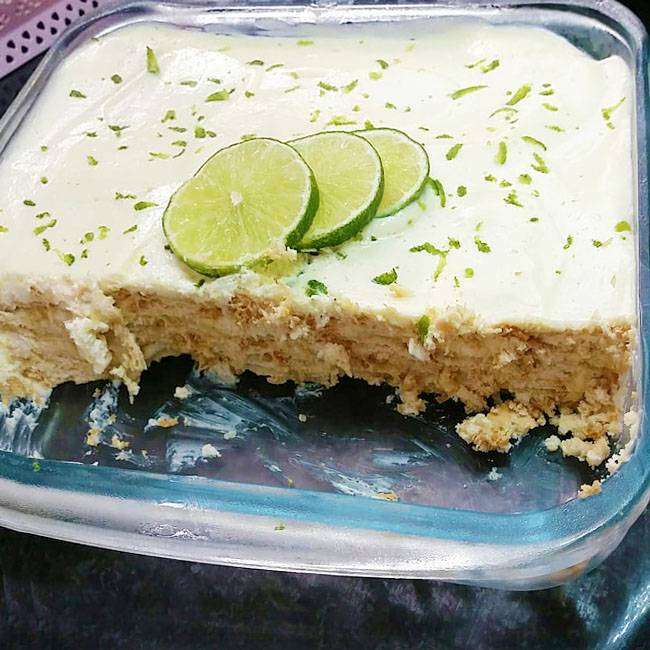 - Preencha a forma com quantas camadas couber, alternando entre o creme de limão e as bolachas, finalizando com o creme por cima;